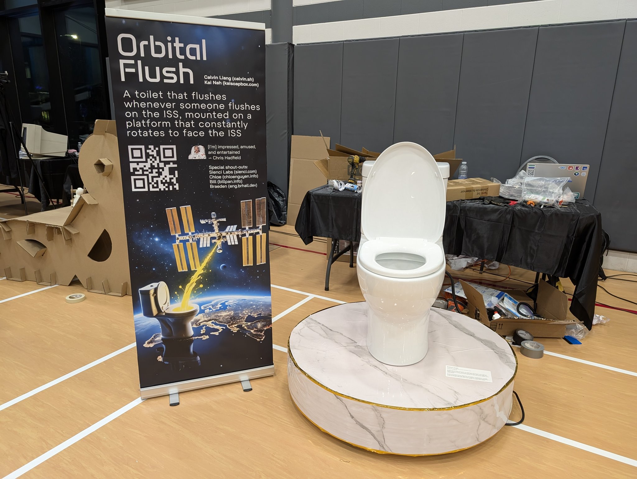 tl;dr: Orbital Flush is a toilet that flushes whenever astronauts on the International Space Station (ISS) flush, mounted on a platform that rotates to face the ISS. Yes, it’s a real toilet, but please don’t actually use it. We built our first prototypes in Vancouver, and the final version in Waterloo for the Socratica Symposium.